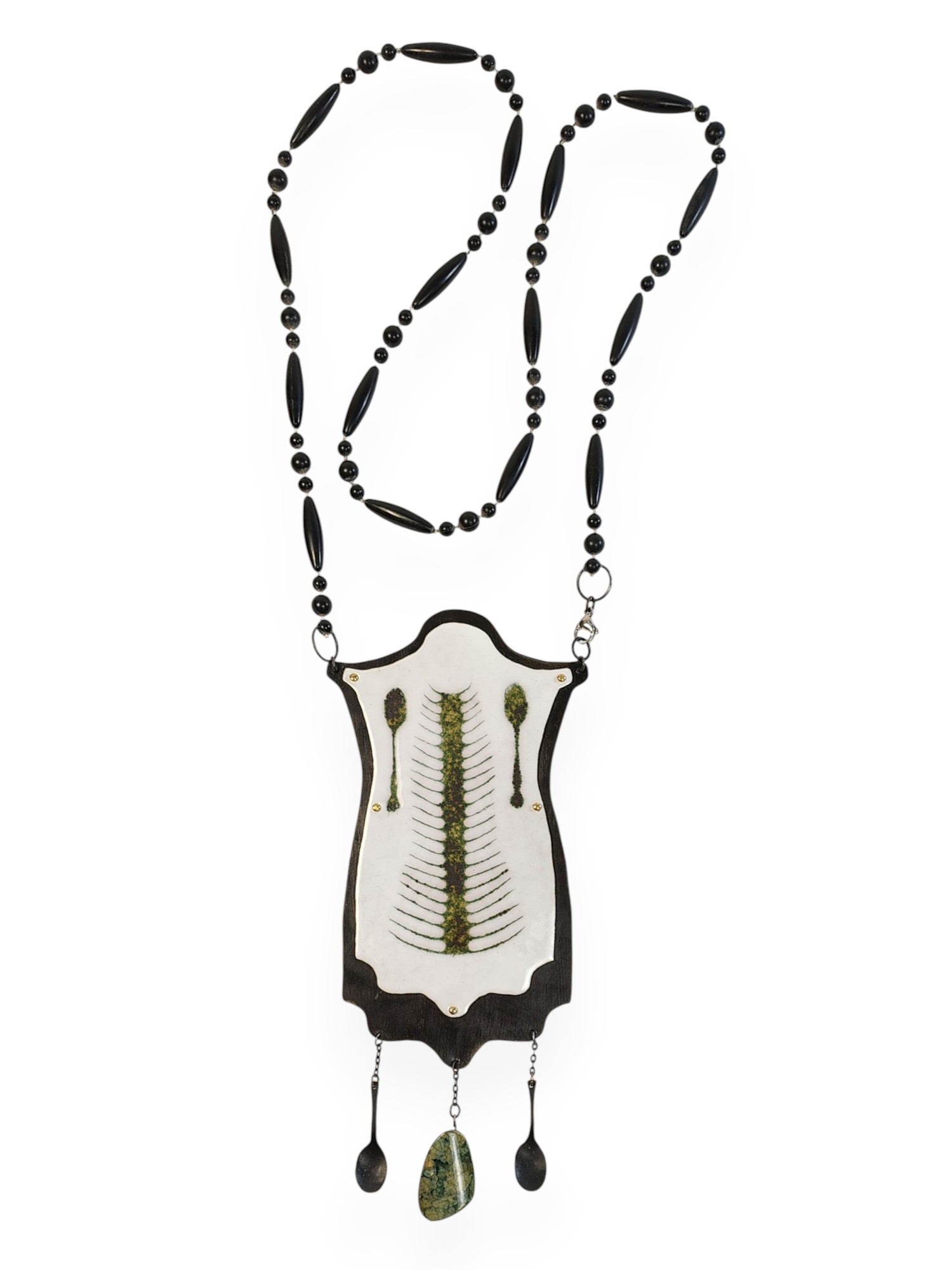 Enamel fired at 900 degrees Celsius, patinated and sgraffito metals, charm applications and bakelite