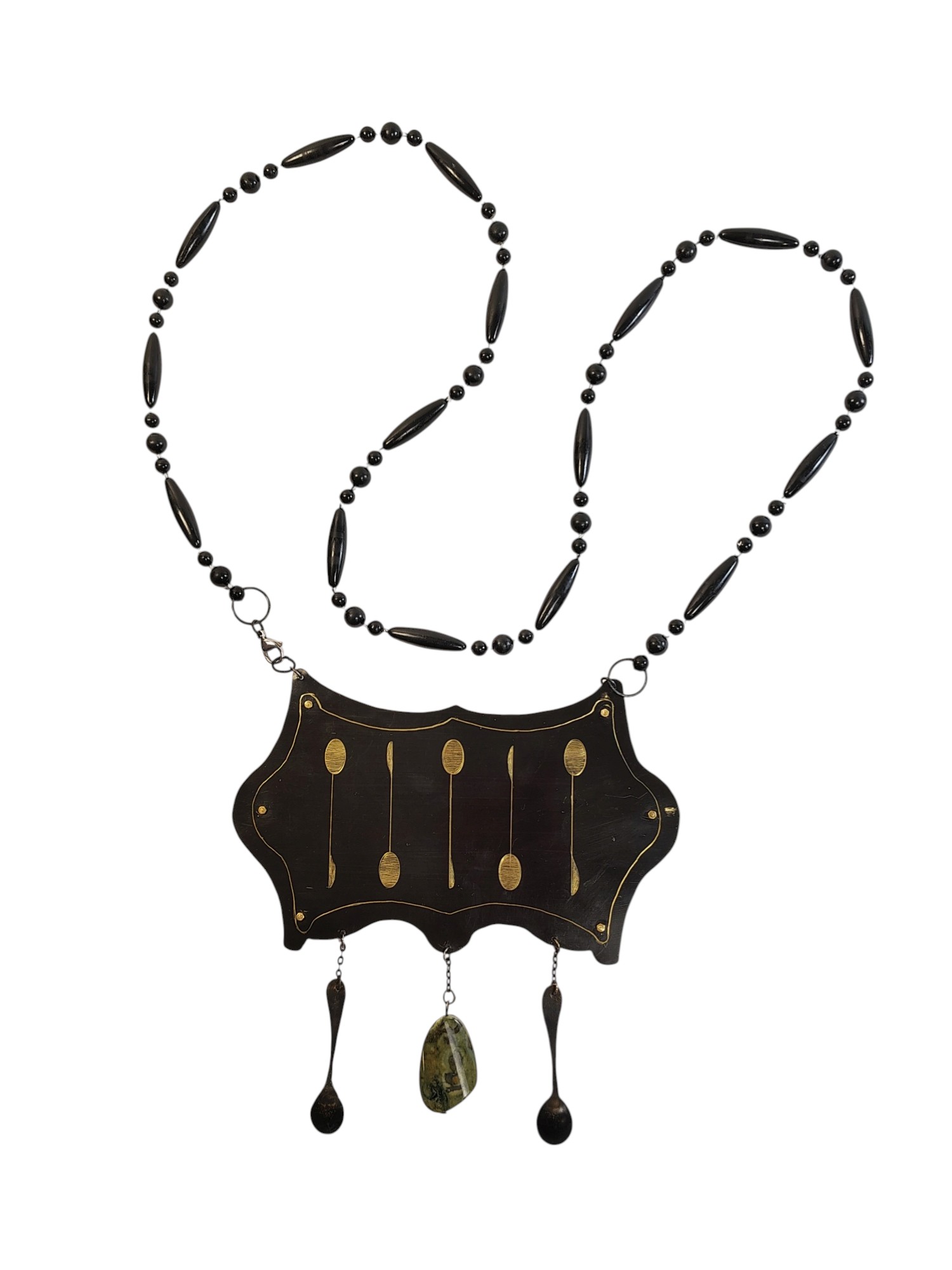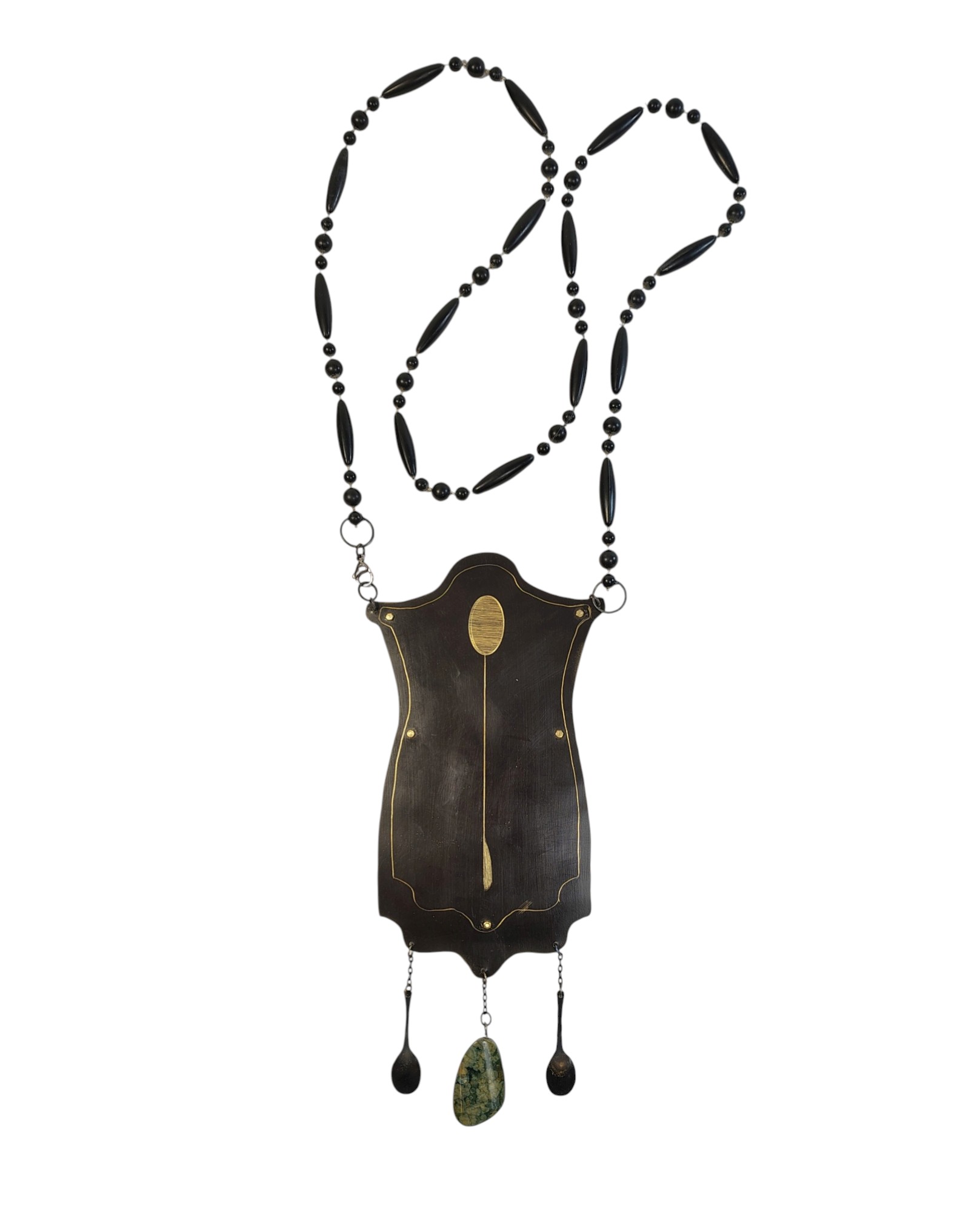 Enamel, copper, brass patinated, green rhyolite and Fragments of a black pearl curtain.