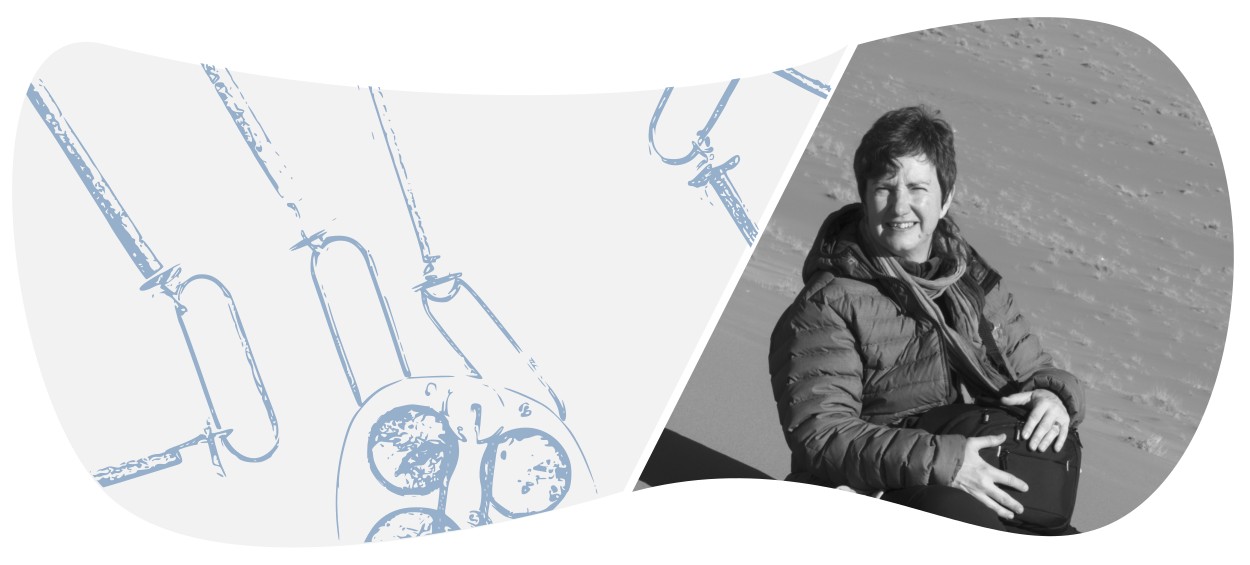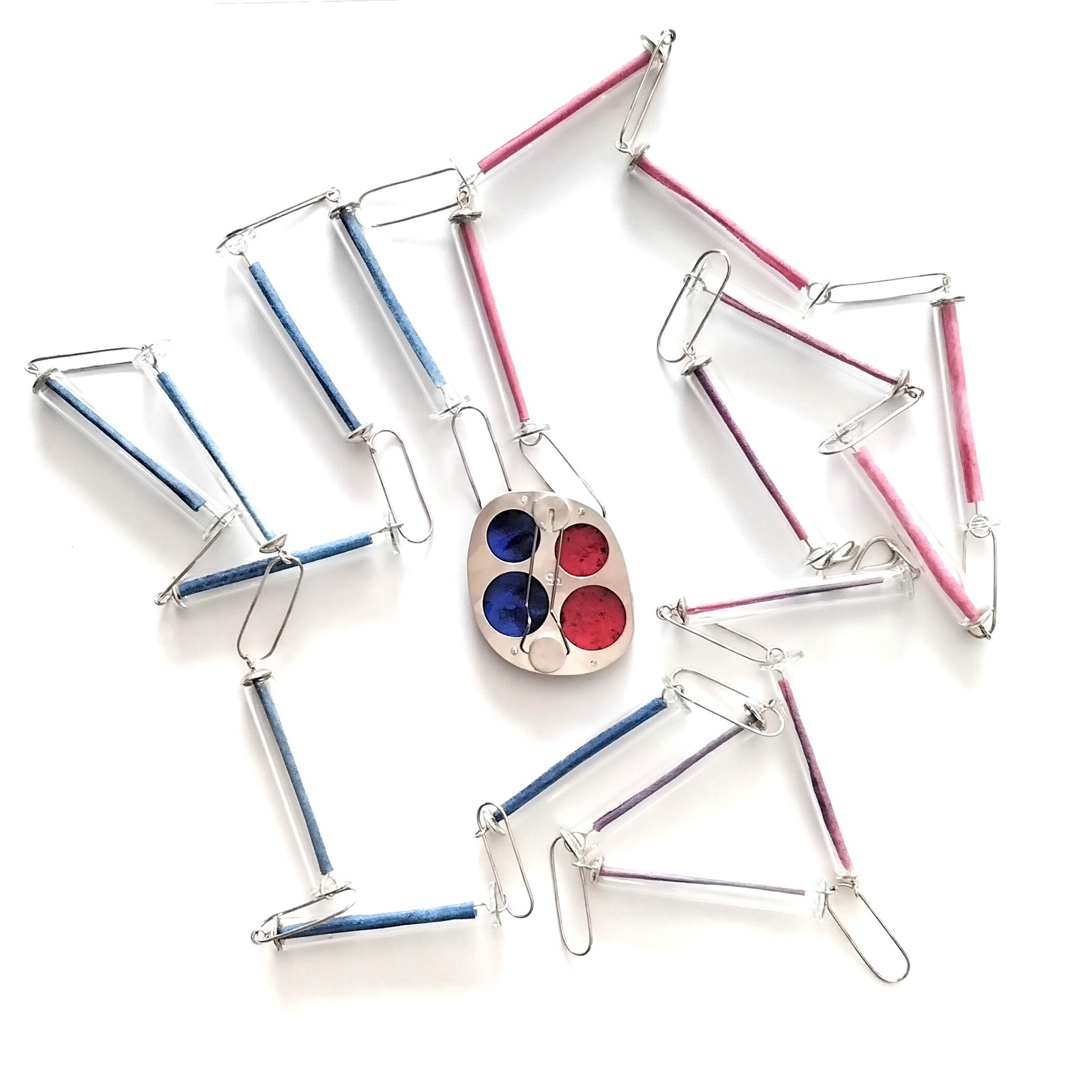 Silver, recycled glass, white batiste fabric dyed by hand with silk paints. Copper, enamels on metal