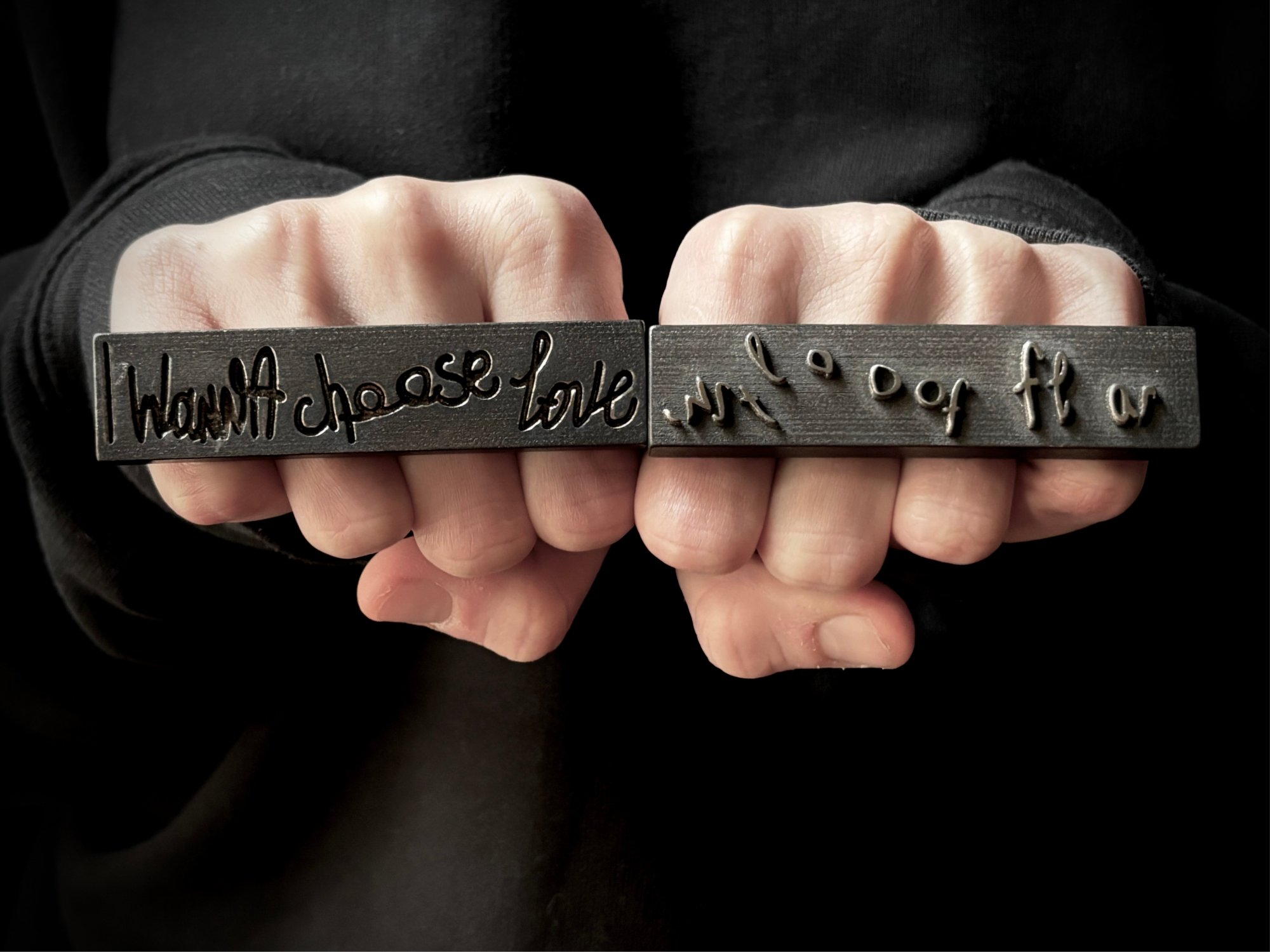 This work consists of a pair of interlocking knuckledusters that form a single solid object when pressed together. When separated, the phrase I wanna choose love | instead of fear becomes legible. The object is a 3D-printed steel puzzle piece, built on a custom process that allows the opposing text forms to fit precisely into one another.