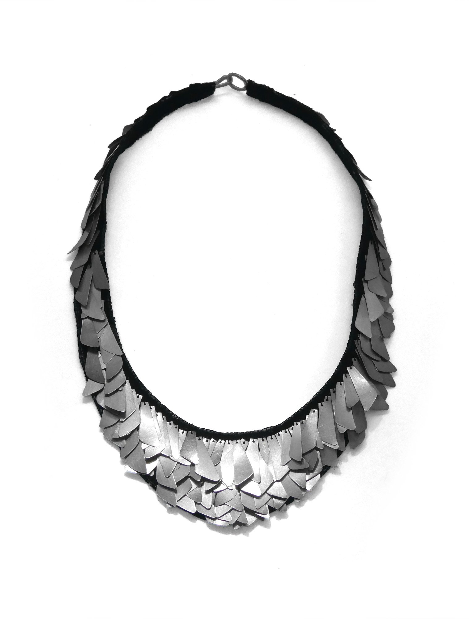 The necklace forms a loose, shimmering mass — light yet dense, delicate yet insistent — always on the edge of movement, of unraveling. Each fragment keeps its own identity while contributing to a fragile balance, a form held together through connection and care.