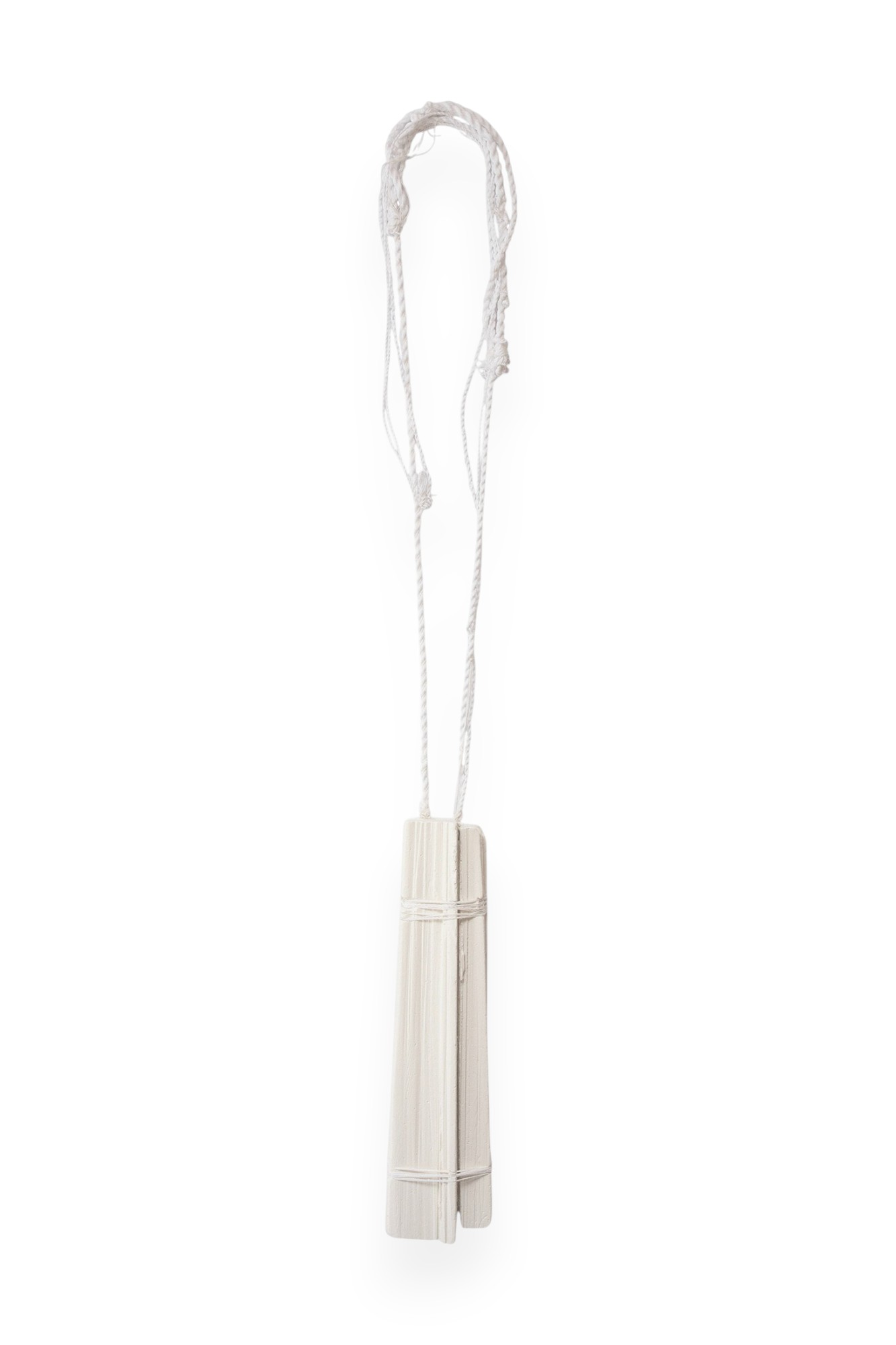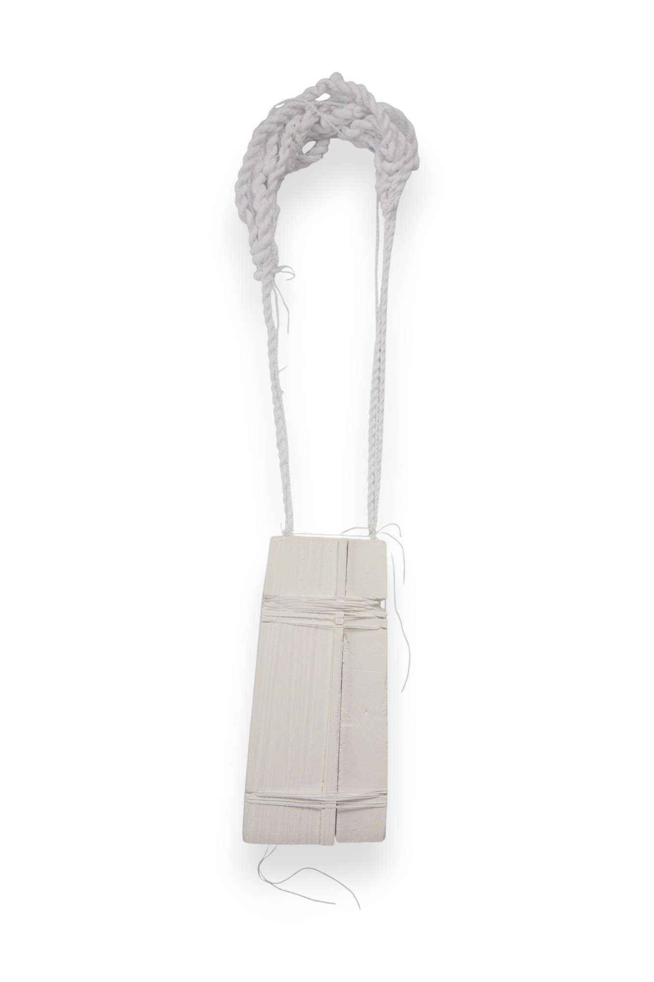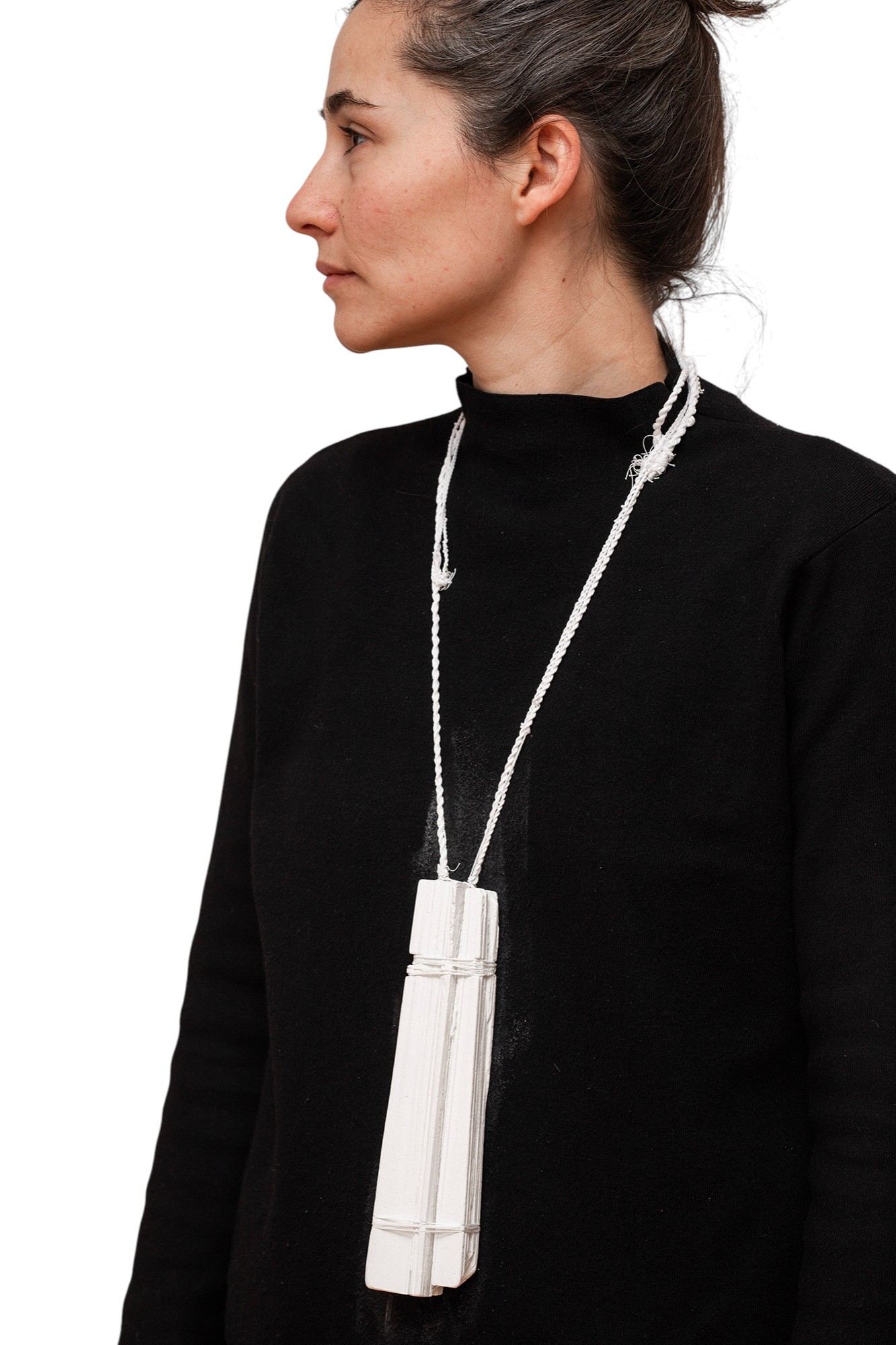 These necklaces continue my ongoing exploration of the dialogue between the body, the object, and the space we inhabit. Crafted from white chalk, they carry the qualities of softness, fragility, and impermanence – a material that invites touch yet resists durability. Each movement of the body subtly alters the object, while the object, in turn, leaves its own traces: faint marks on the skin, a dusting on the fabric, silent evidence of contact and time.