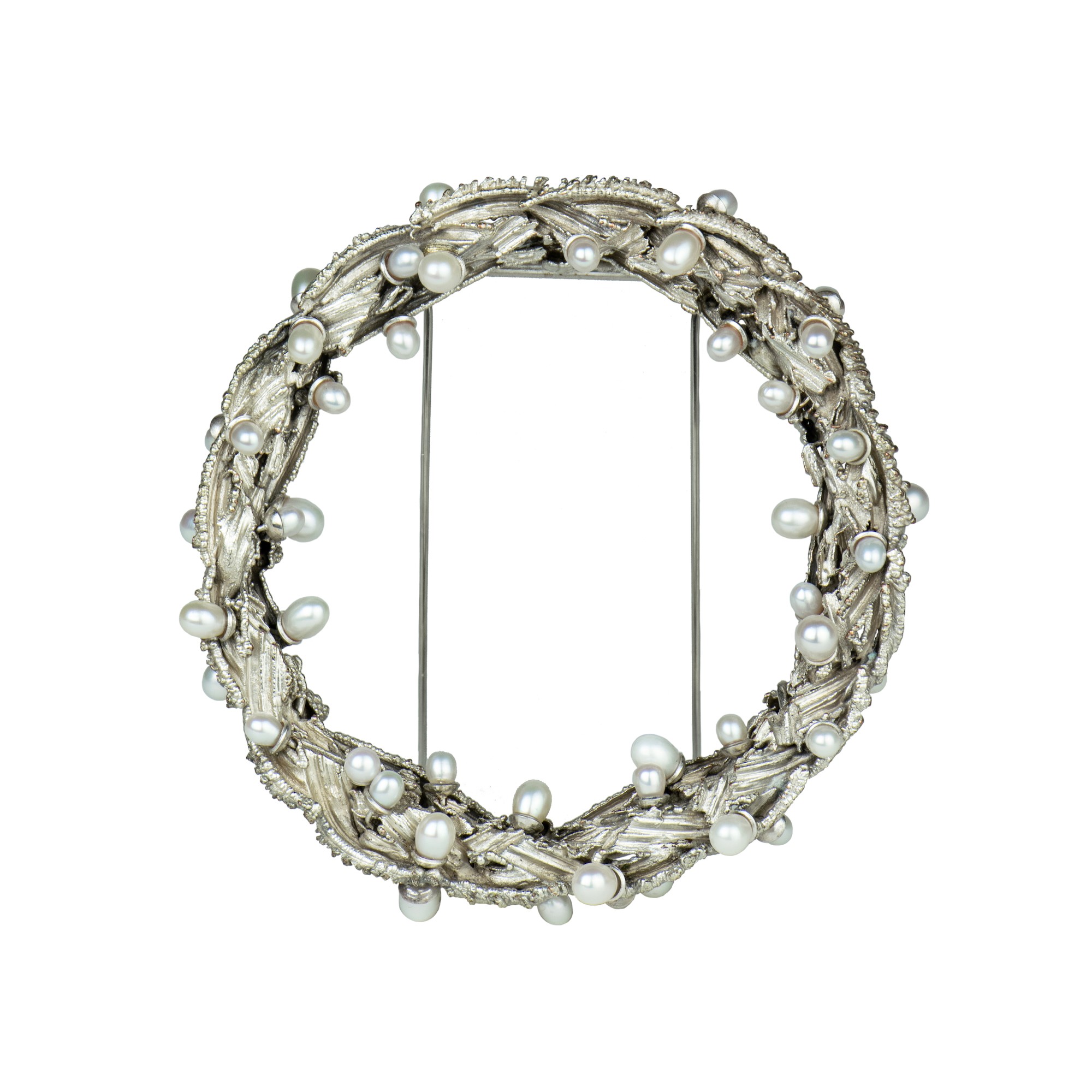 Electroformed copper thrift store basket, sterling silver, enamel, pearls, steel